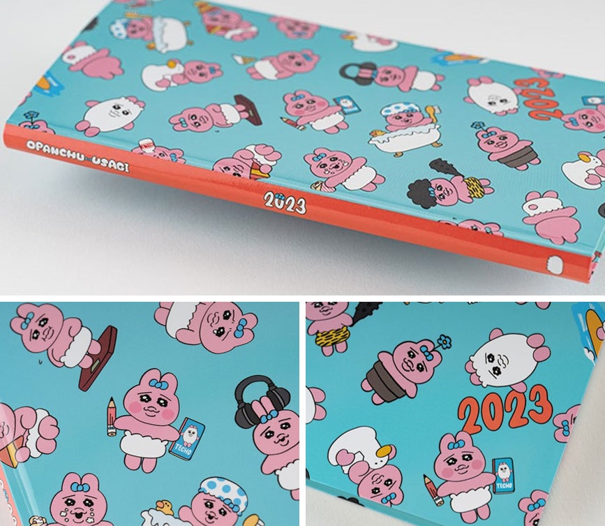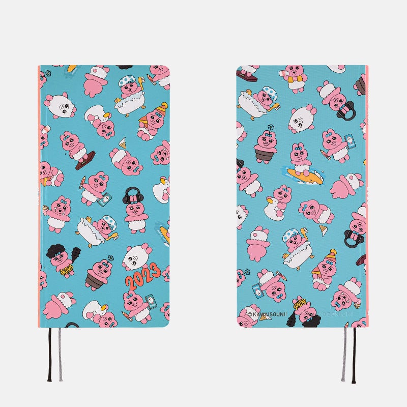 さまざまな「おぱんちゅうさぎ」が一面に描かれたにぎやかなweeks(週間手帳)。さまざまな表情のおぱんちゅうさぎがいる中でとくに注目なのが、中央付近に配された、ほぼ日手帳とえんぴつを持っているおぱんちゅうさぎ。ほぼ日手帳ならではのオリジナルデザインです。ポップな書体の「2023」は、明るいピンク。背も同じピンクで、おぱんちゅさぎのロゴ、象徴的なブルーのリボンをつけた「2023」、そしておぱんちゅが描かれています。4月からの新しい年度をおぱんちゅうさぎとたのしく過ごしていただけます。