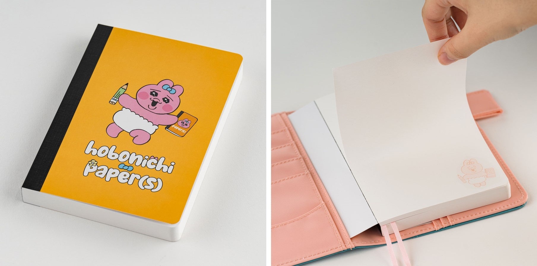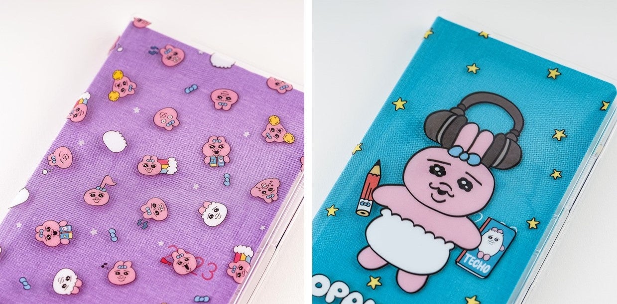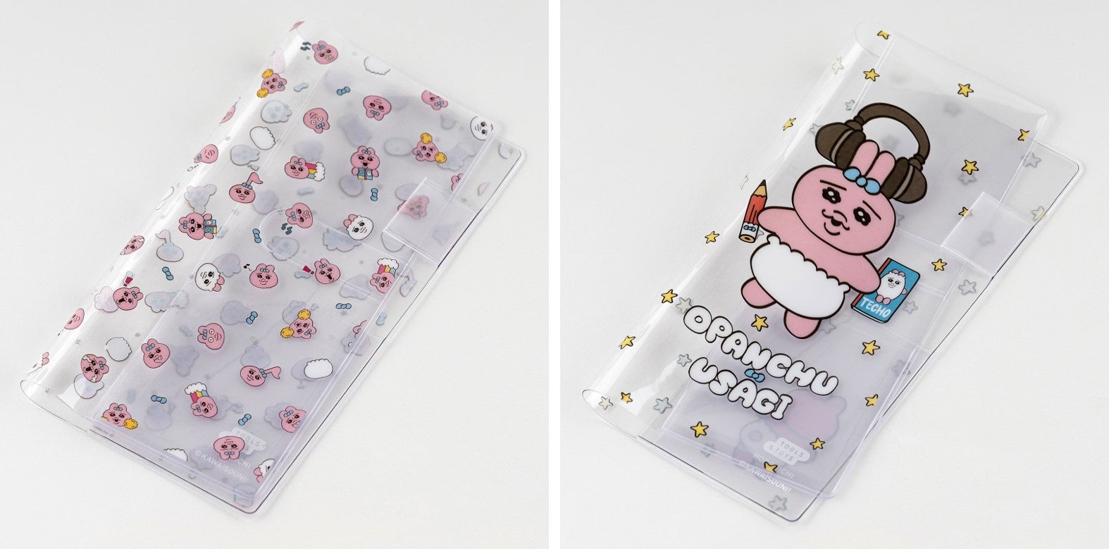 ほぼ日手帳weeksの上に装着すると傷や汚れを防ぐ「クリアカバー」は、2種類のデザインを用意しました。無地のweeksにつけることで印象をガラッと変えてたのしめます。おぱんちゅうさぎのいろんな表情がたのしめる「いいおかお」(画像左)は、キラキラ光る銀色の星や、ブルーのリボンが散りばめられているポップで明るいデザイン。「へっどふぉん」(画像右)は、ヘッドホンを耳につけたおぱんちゅうさぎがほぼ日手帳とえんぴつを持っている、オリジナルデザインです。