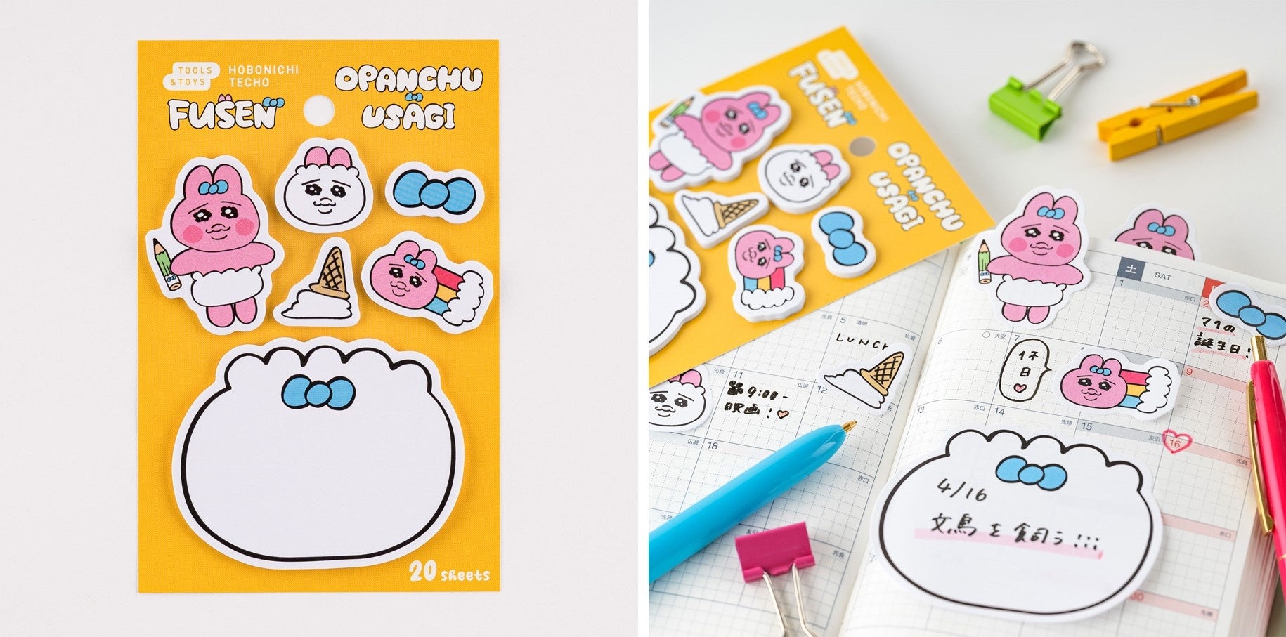おぱんちゅうさぎがかたどられたふせんは、象徴的なブルーのリボンやおぱんちゅうさぎの顔だけのイラストなど、全6種類。オリジナルデザインの、えんぴつを持っているおぱんちゅうさぎもいます。