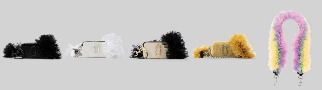 左からTHE SNAPSHOT DTM TOMO KOIZUMI × MARC JACOBS 78,100円 ※2色ともに / THE SNAPSHOT TOMO KOIZUMI × MARC JACOBS 74,800円 / THE PLUSH SNAPSHOT TOMO KOIZUMI × MARC JACOBS 86,900円 / SHOULDER STRAP TOMO KOIZUMI × MARC JACOBS 29,700円