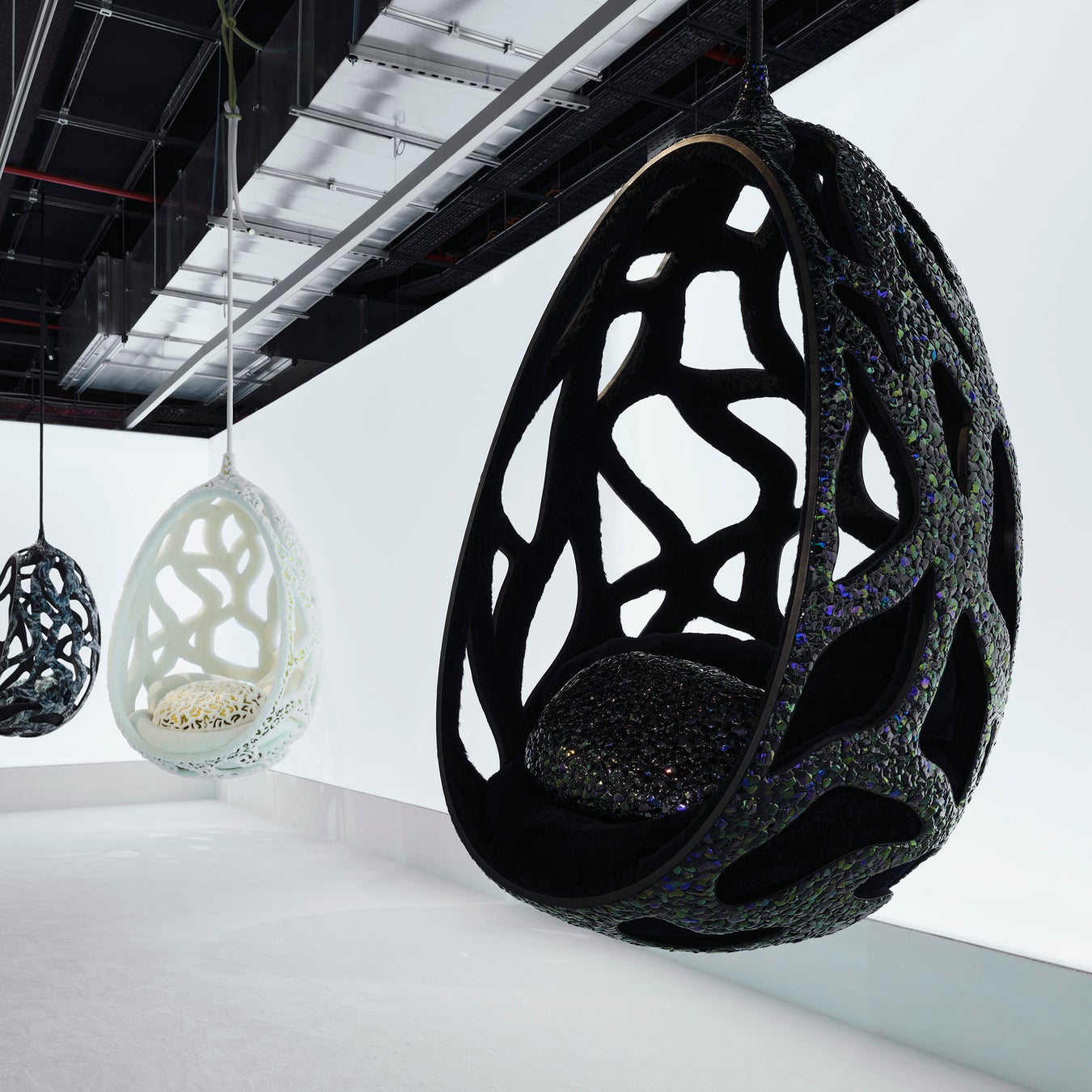 これらの並外れた新作のビジョンを実現するために、ウンベルト·カンパーナは、ファッション界で最も名高い芸術工房とのコラボレーションを展開。レザーのシークインやフェザー、ビーズ、金糸刺繍など、それぞれ1点限定で制作されるチェアはいずれも、かつてないほどラグジュアリーな質感を追求しています。その贅沢な質感と洗練された素材がそれぞれのオブジェを、吊り下げる芸術作品へと変えています。