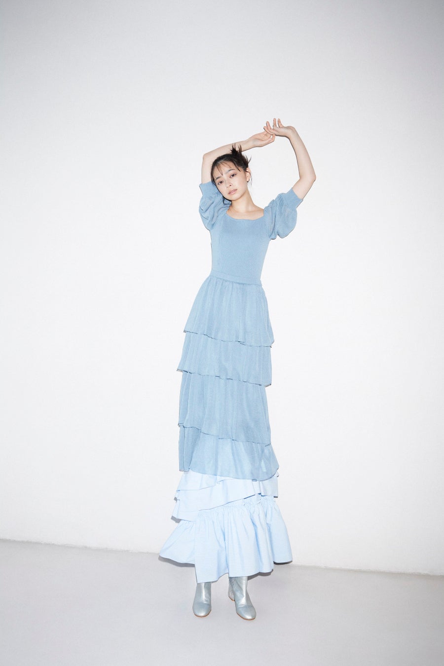 ティアードが美しいブルーのワンピースは、ニット素材ながらシアー感のある編地なので春らしい軽やかさを演出します。