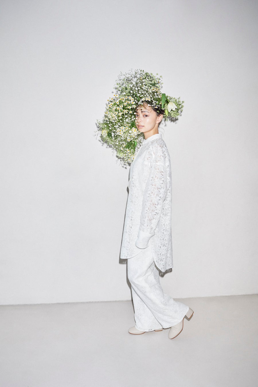 バンドカラーシャツとパンツのセットアップスタイルは、総レースの生地を採用しているのでメンズライクになりすぎず女性らしく着こなせます。