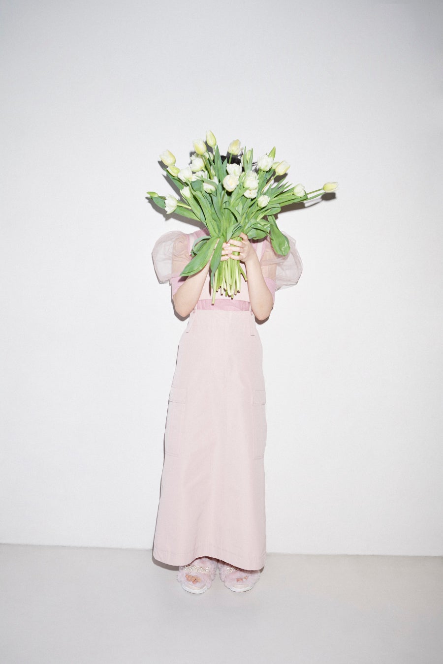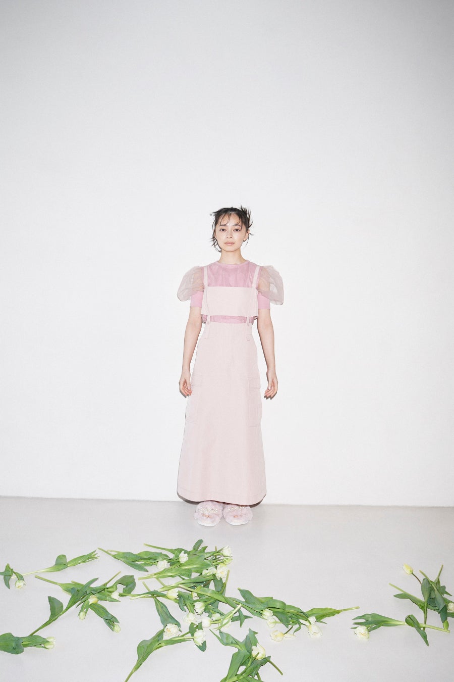 ミリタリーディテールを取り入れたジャンパースカートは、チュールのパフスリーブトップスをインしてフェミニンさを兼ね備えたスタイリングがおすすめ。