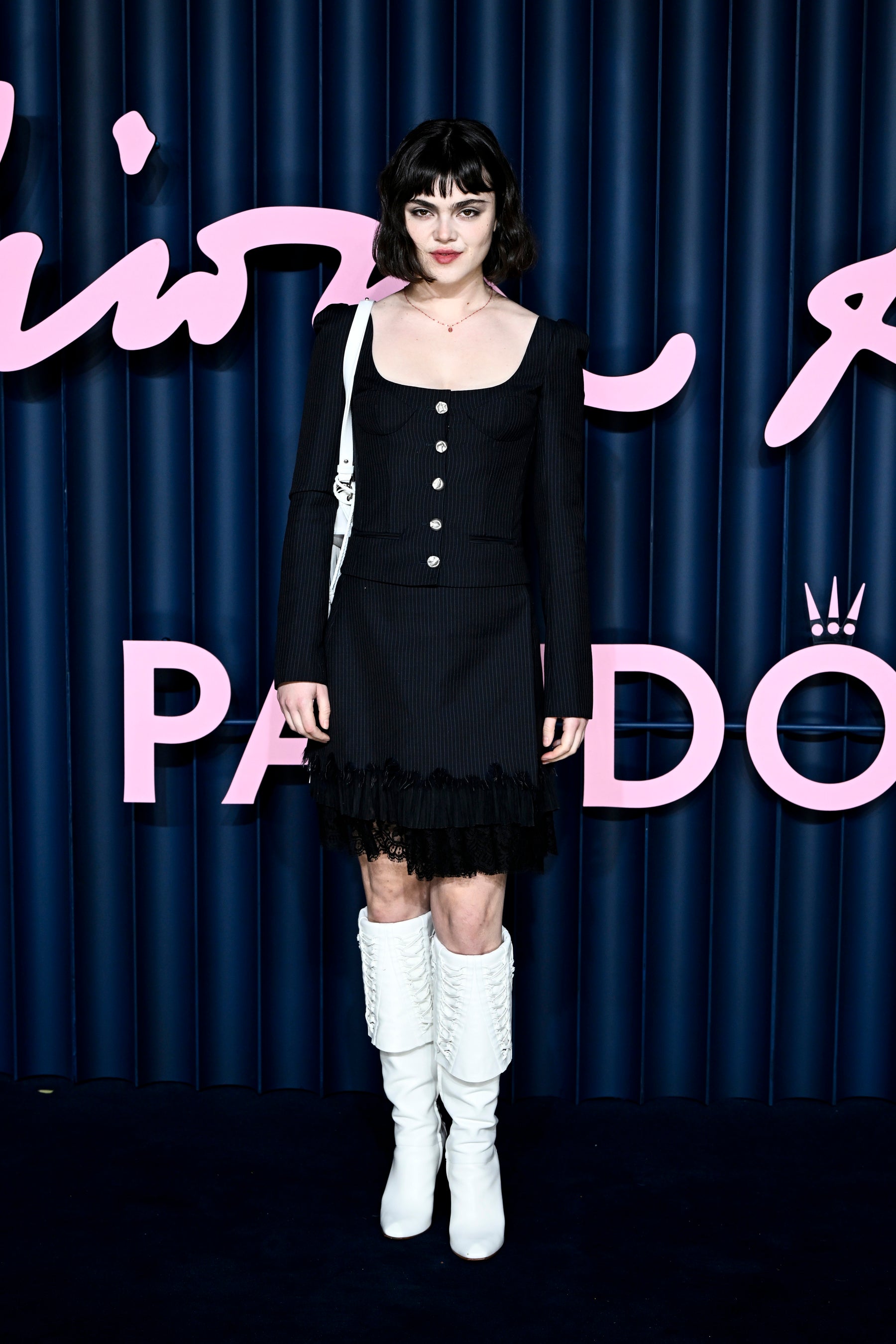 2026年春夏コレクションより、ネイビーの細いピンストライプを施したウールモヘア製のオープンネックライン テーラードジャケットとスカートに、マットシルバーメタルのシザーイヤリング、フリンジディテールをあしらったホワイトレザーのマンタ クラッチ、コルセット風レースアップディテールをあしらったホワイトレザーのホーンヒールブーツを合わせています。