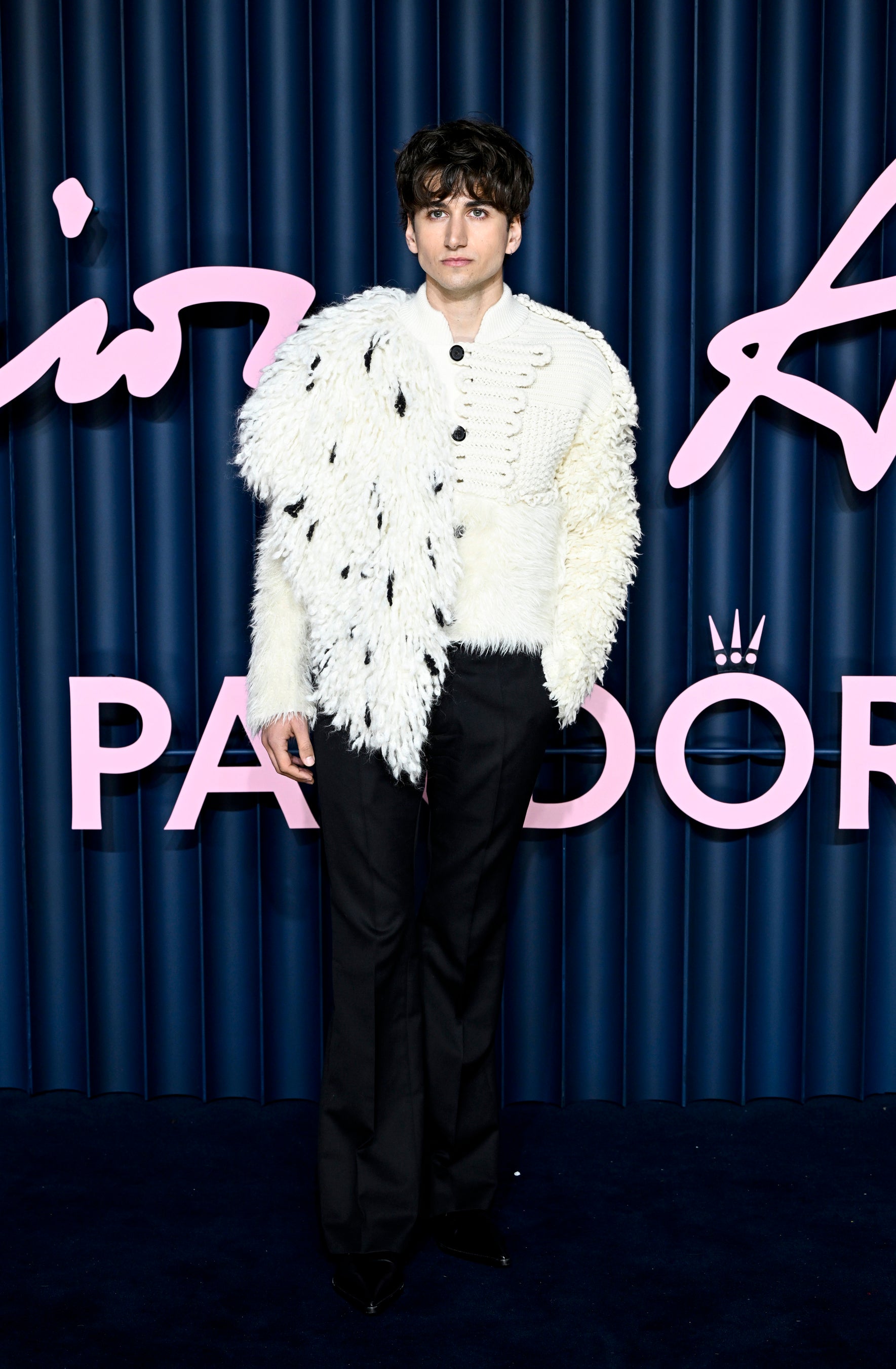 2025年秋冬コレクションより、アイボリーとブラックのウールモヘアにクロシェで儀礼服のディテールをあしらったアシンメトリック パッチワーク カーディガンと、ブラックウールギャバジン キックバックパンツに、レザー ヘロン オックスフォードを合わせています。