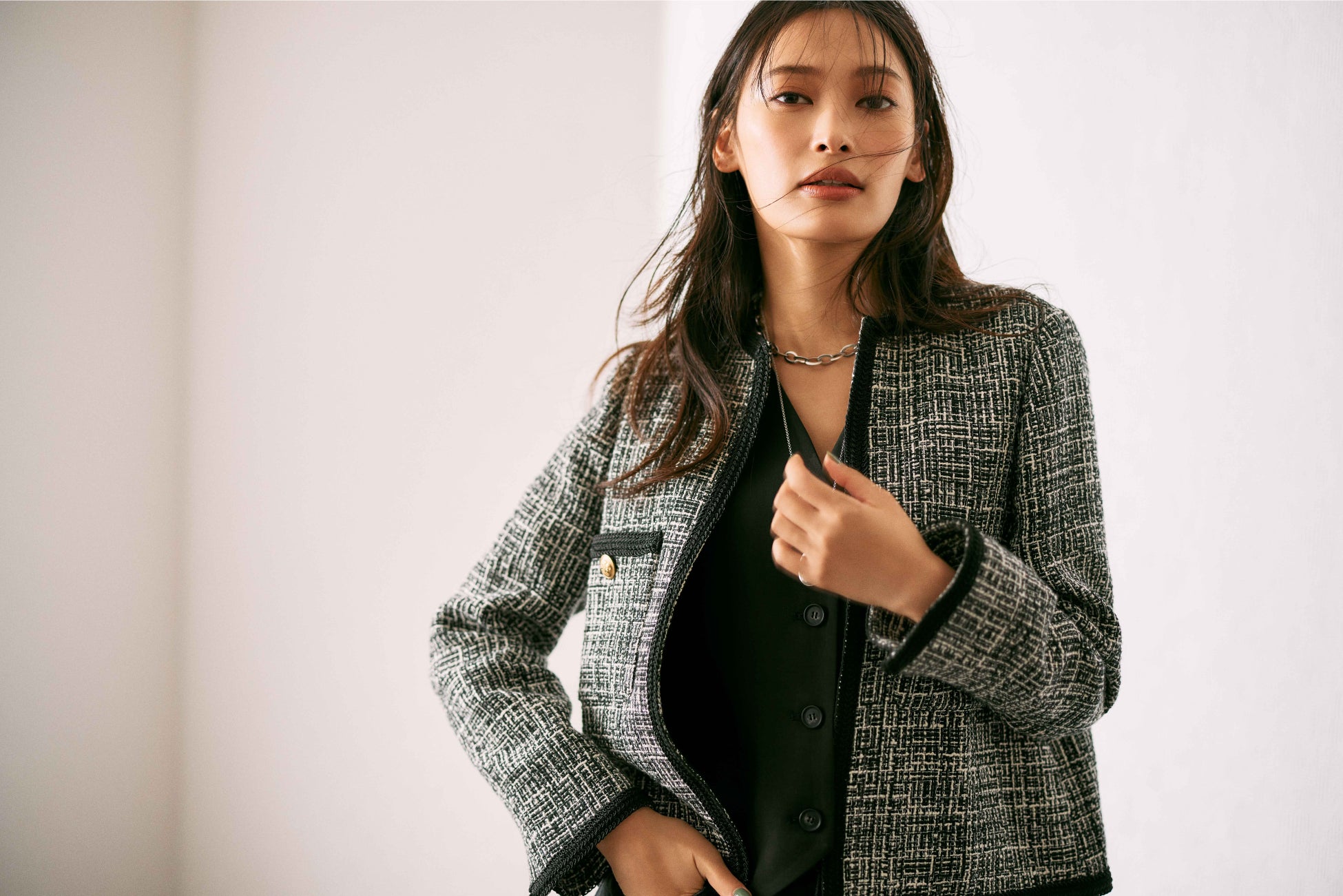 ブランドの代名詞ともいえるブレザーやツイードジャケット、デニムのコーディネートなどを軸に