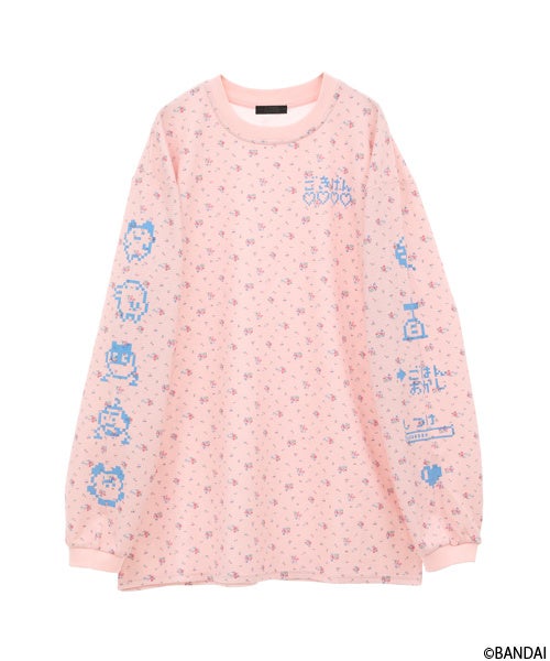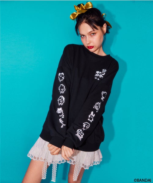 両袖にたまごっちの仲間たち、左胸には8bitにアレンジされたオリジナルキャラクターのPEPEとキャンディロゴを組み合わせたグラフィックをプリントしたスウェットトップスです。