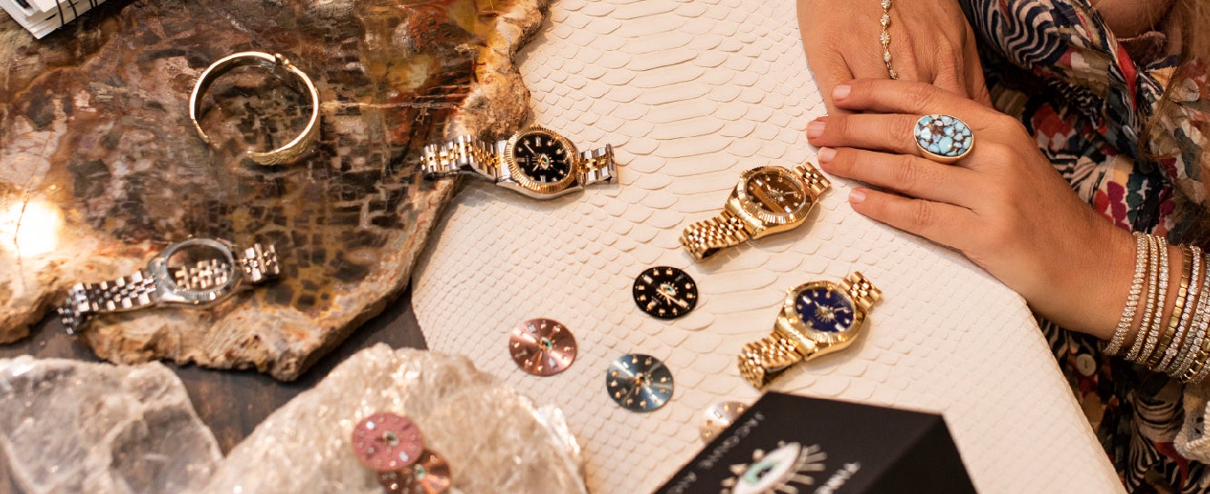 天然クリスタルでインデックスを飾ったサンレイダイヤルが美しい、ジャッキー・アイシュの幻想的なレンズを通してデザインされたタイムレスなコレクションを数量限定にて発売いたします。