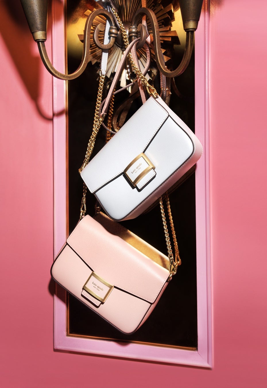 先シーズン本格デビューの、テクスチャードレザーを用いたクリーンなラインが特徴の、シンプルでありながらも機能的なデザインの新アイコングループ。モダンなエナメル素材でケイト・スペード ニューヨークのヘリテージを表現した新しいロゴプレートとマイクロスエードのライニングが特徴。今シーズンは、ホリデーシーズンらしい新色のocean beach、mochi pinkが新たに加わり、新素材のツイードもピンクカラーで登場します。Katy flap chain crossbody in mochi pink and ocean beach ¥48,400 (H11.5 x W6.7 x D5.5cm)