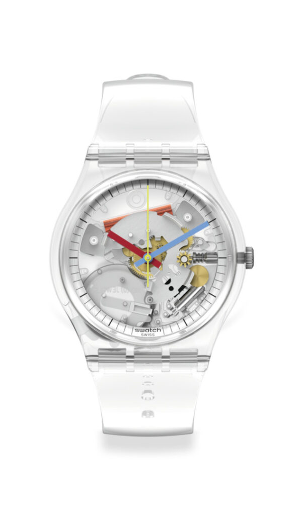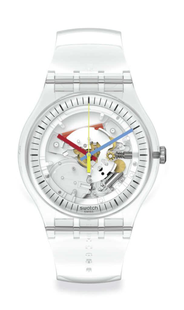 シンプルさが持つパワー。Swatch CLEAR コレクションは ミニマリズムの基本に戻り、針のはじけるカラーによって引き立てられています。