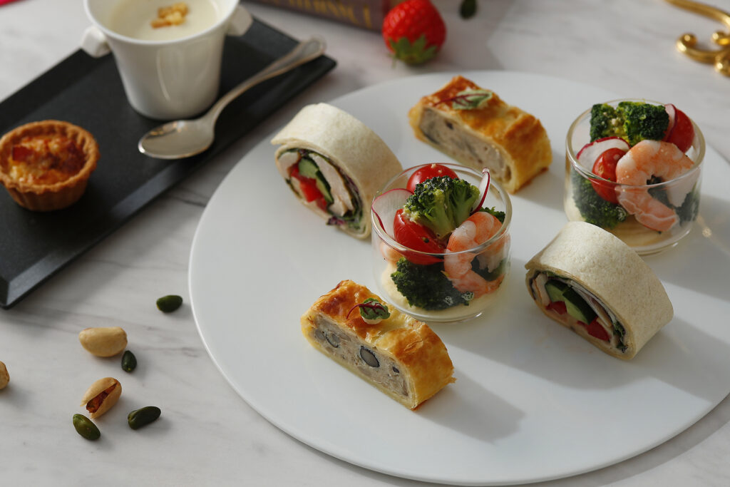 乾杯酒、ハイティースタイルオードブル、スープ、選べるパスタ、アフタヌーンティースタイルデザート(苺のモンブラン、ピスタチオムース、ピスタチオのムラングシャンティー、ピスタチオのマカロン、プティフール各種) 、ハーブティーまたは コーヒー、紅茶など(10種類)