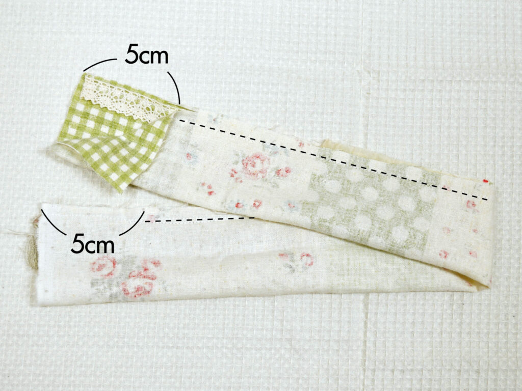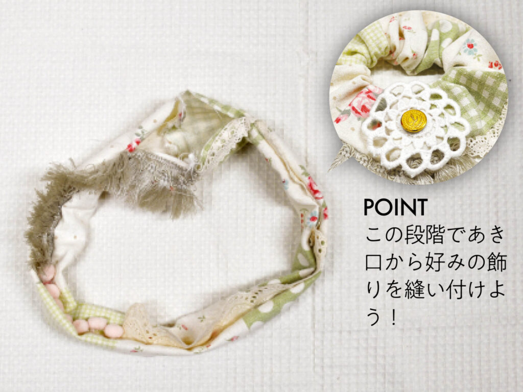 1. 12cm×60cmにカットした生地の片側に、レースやポンポンなど好みの飾りを縫いつける。