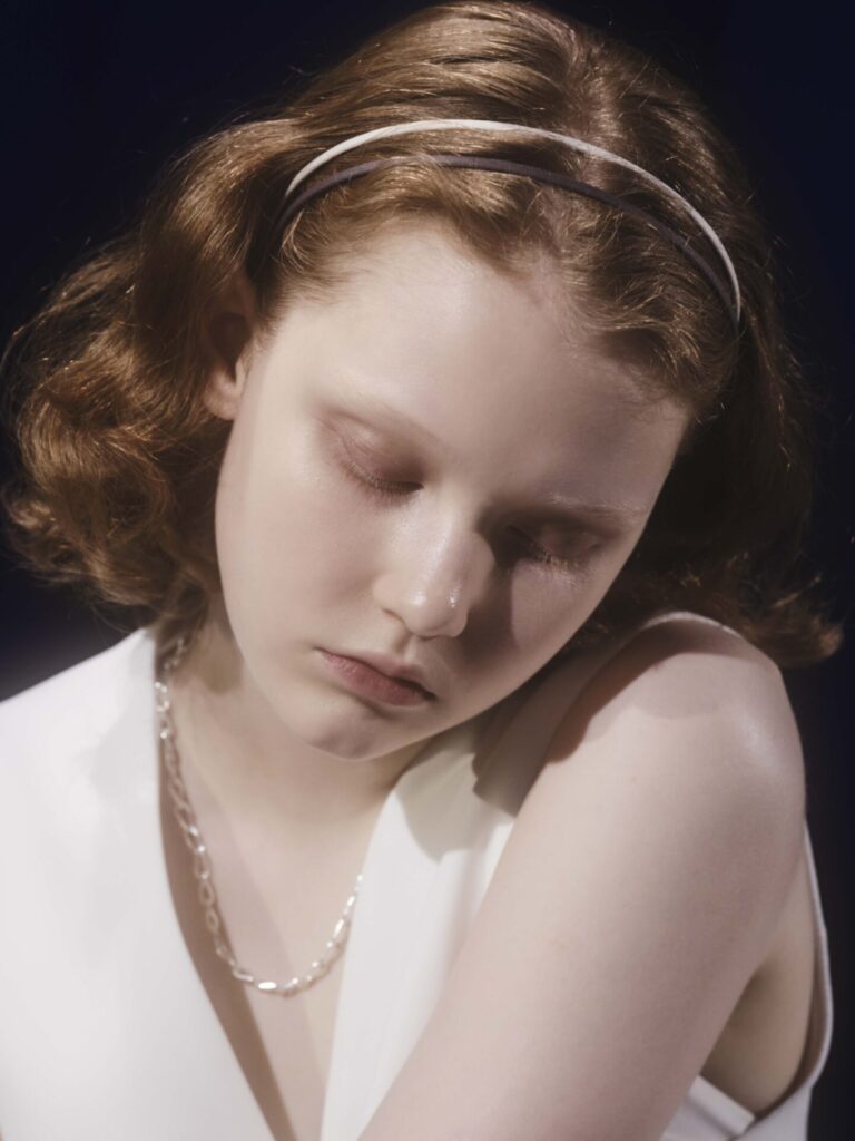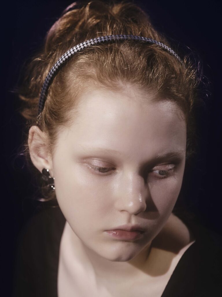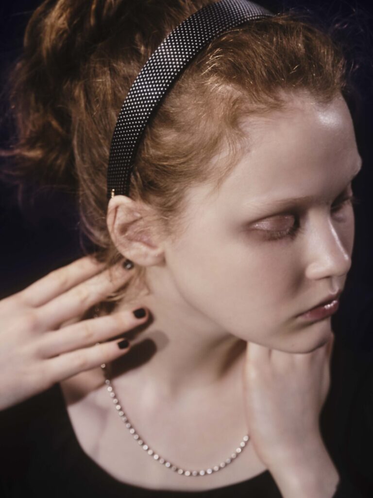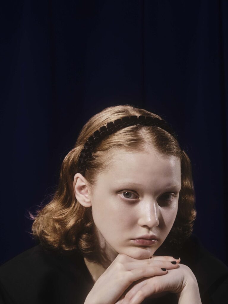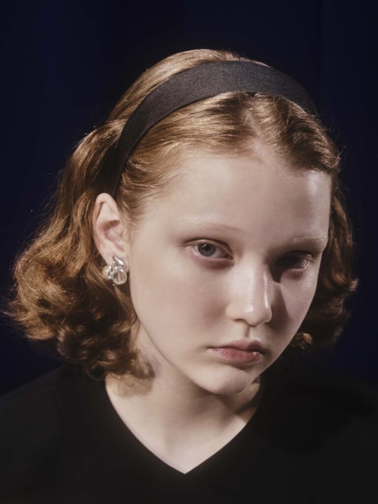 ベロア素材のリボンが波打つヘッドバンドは、マジックショーがおこなわれる部屋のカーテンがイメージ。ガーリーな印象とは裏腹に、実際に着用するとクラシカルなムードが漂います。丸みのあるデザインとマットな質感で、表情をやわらかに見せてくれる効果も。