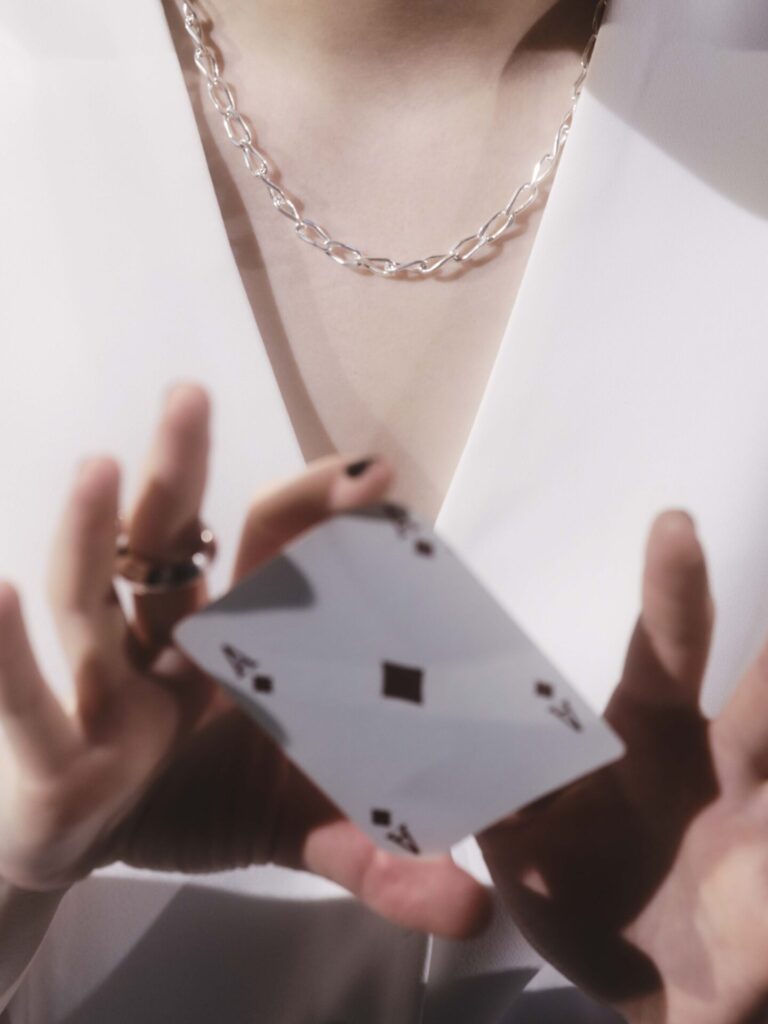 マジシャンがカードやチェーンを操り人々を魅了する高揚感と驚きに満ちたマジックショーをイメージしたホリデーコレクション。 ブランドを象徴するオブジェのような佇まいのイヤリングはホリデーコレクションらしい星やチェリーなどラッキーモチーフで顔周りをホリデームードに盛り上げて。 この冬欠かせないアイテムになりそうなヘッドバンドは、チェックやドットなど R I S47らしいシックな色柄バリエーションが豊富。