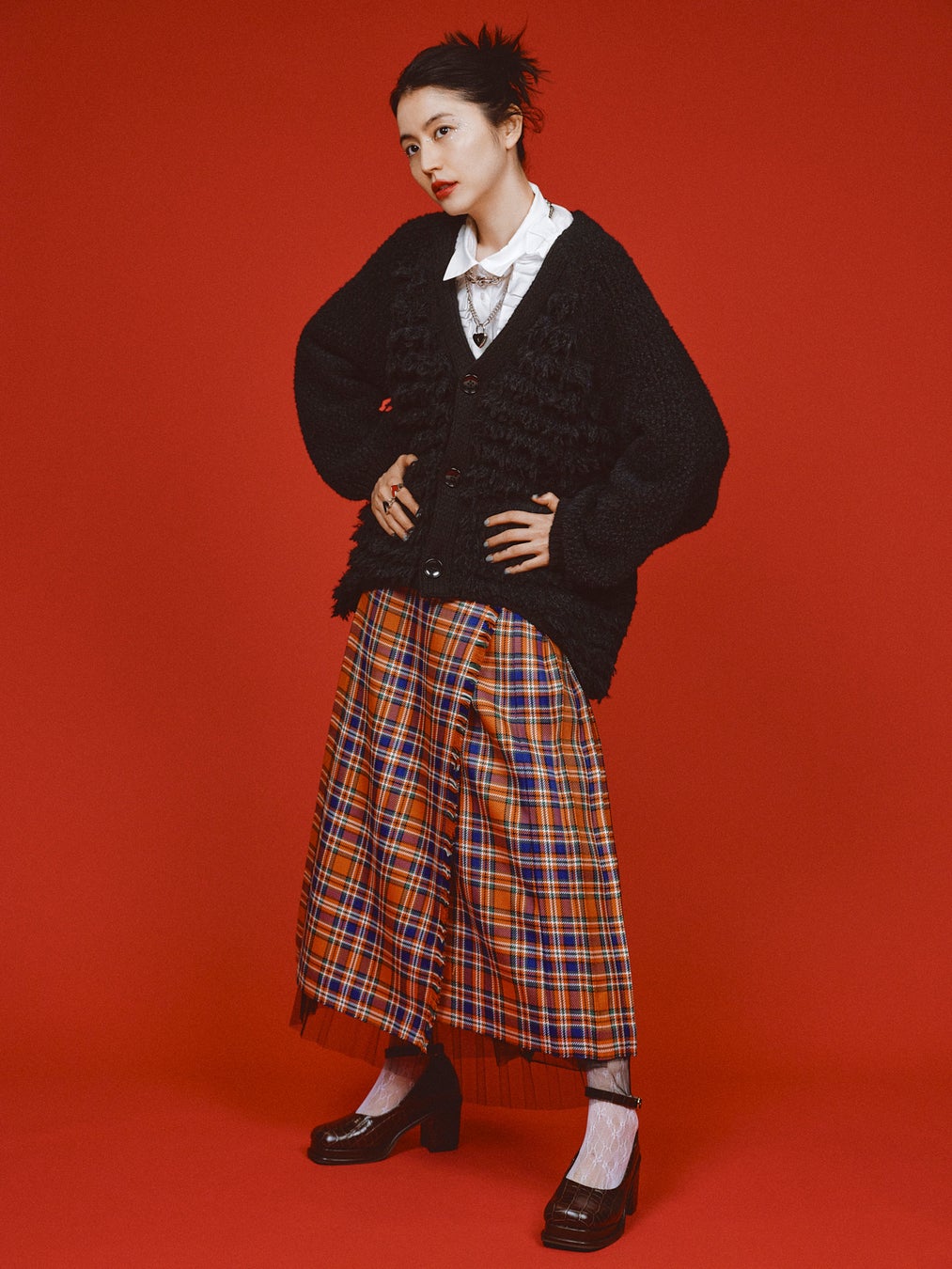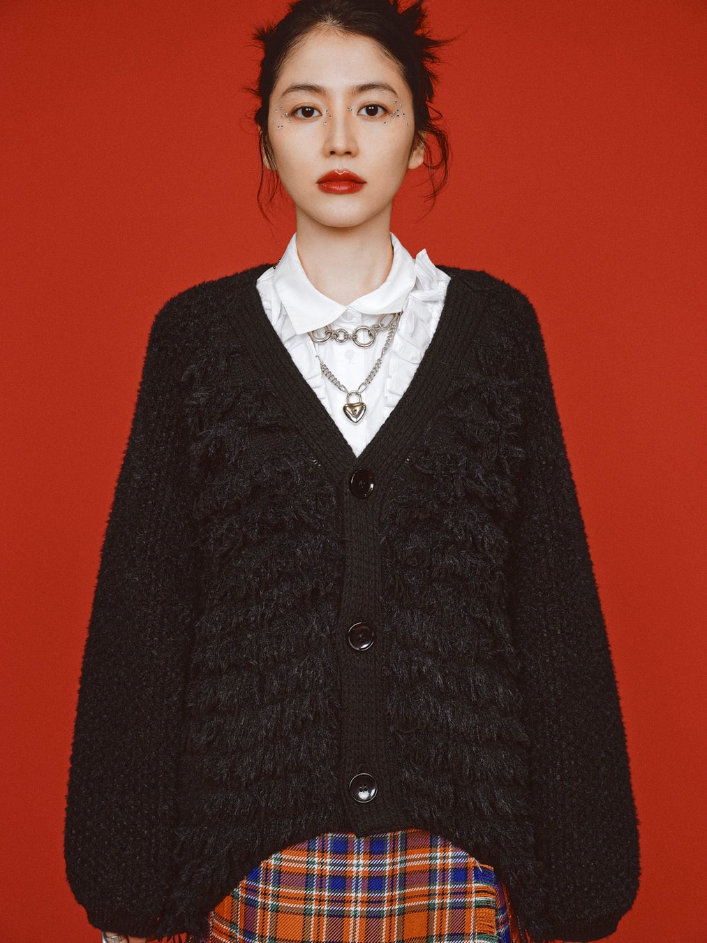 長澤まさみが着用するのは、贅沢に5種類の糸を使用したフープフリンジ仕様のニットカーディガン。後ろ裾に向かって丸くラウンドするヘムラインとボリュームたっぷりのアームもポイントです。着用スタイルは、トラッドなスタイリングながらも、チェックスカートのインナーにチュールスカートを合わせたり、シルバージュエリーの重ね付けでレディな着こなしに。