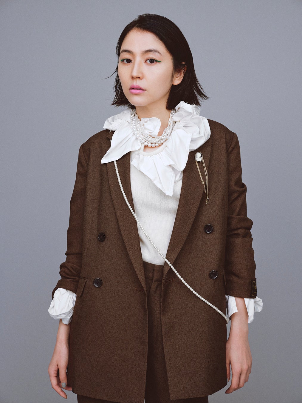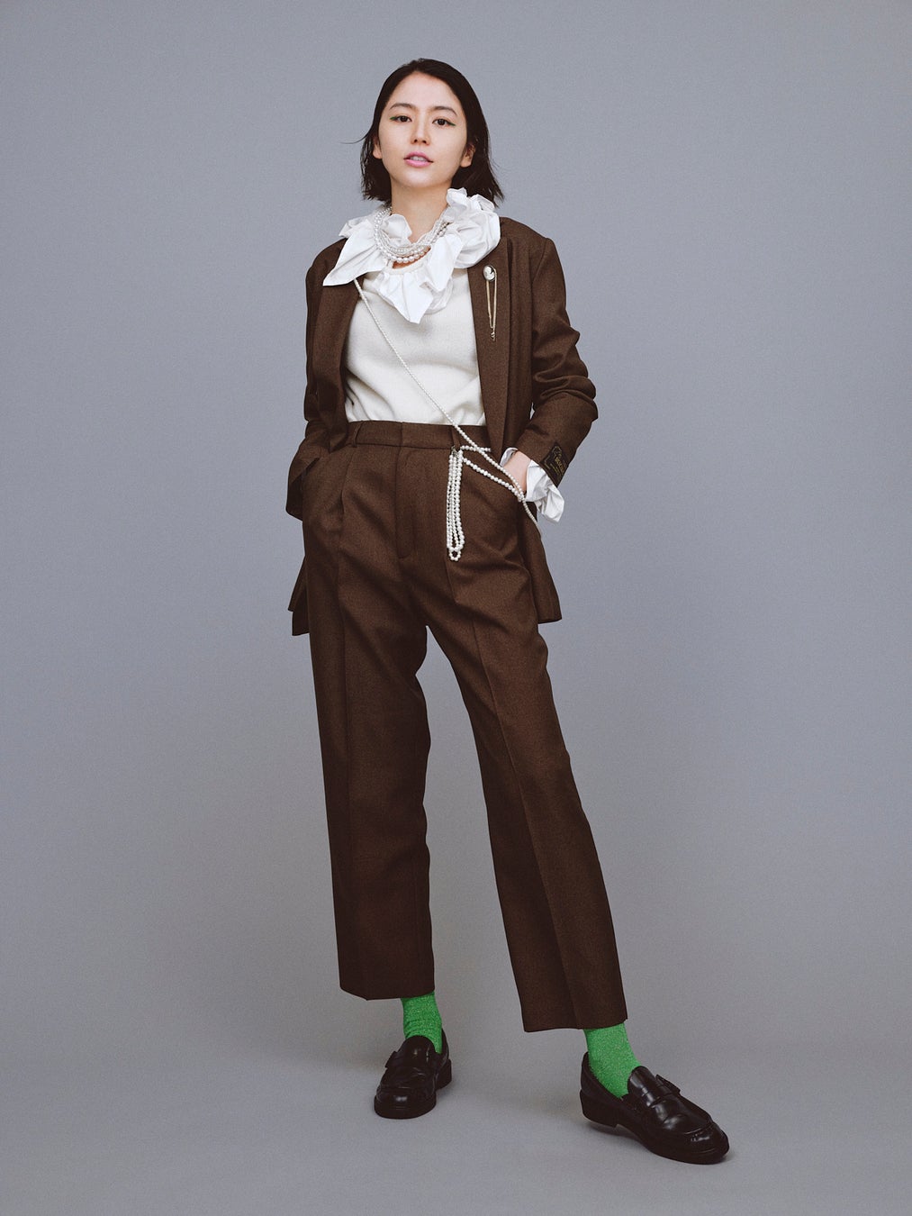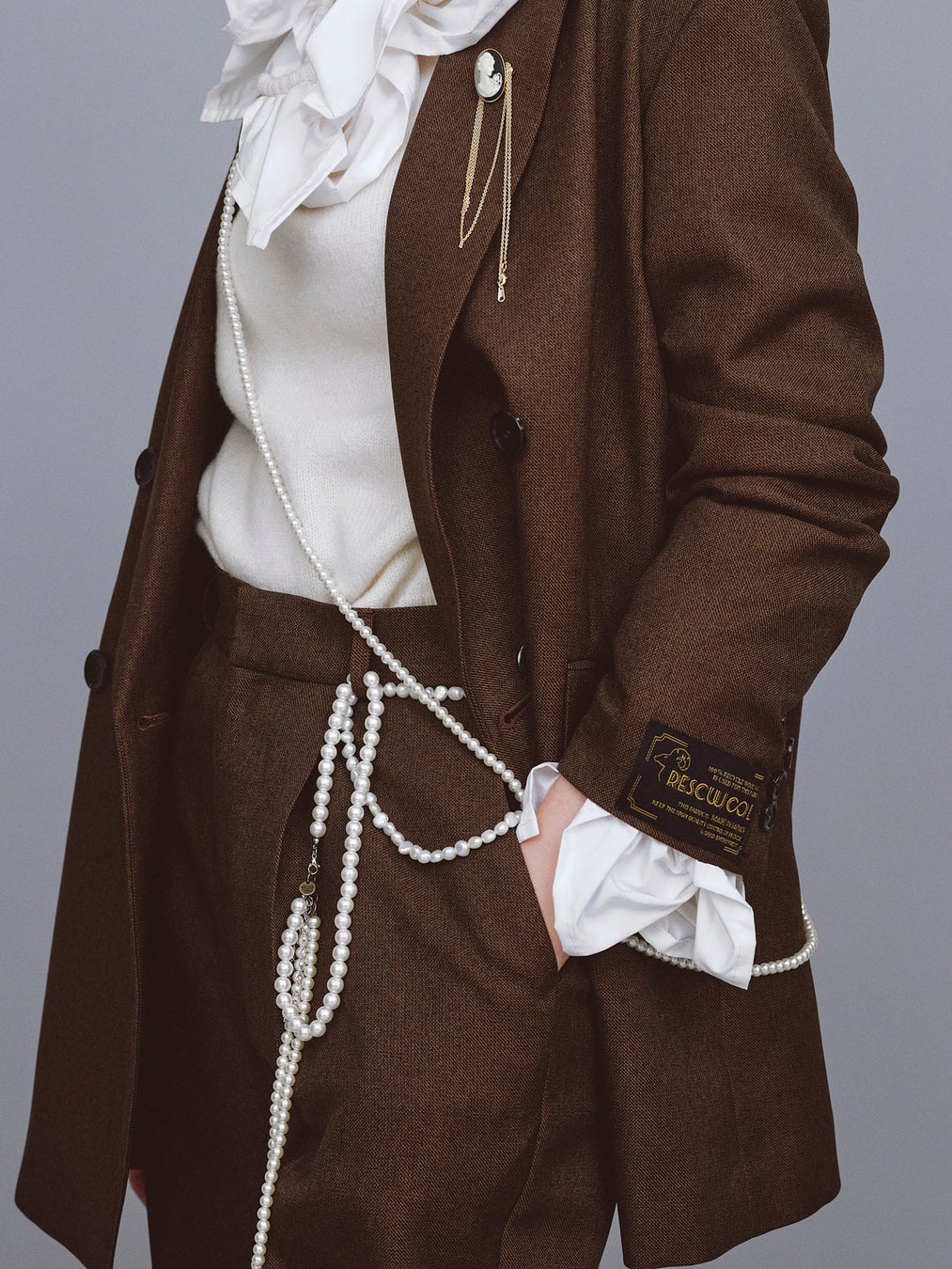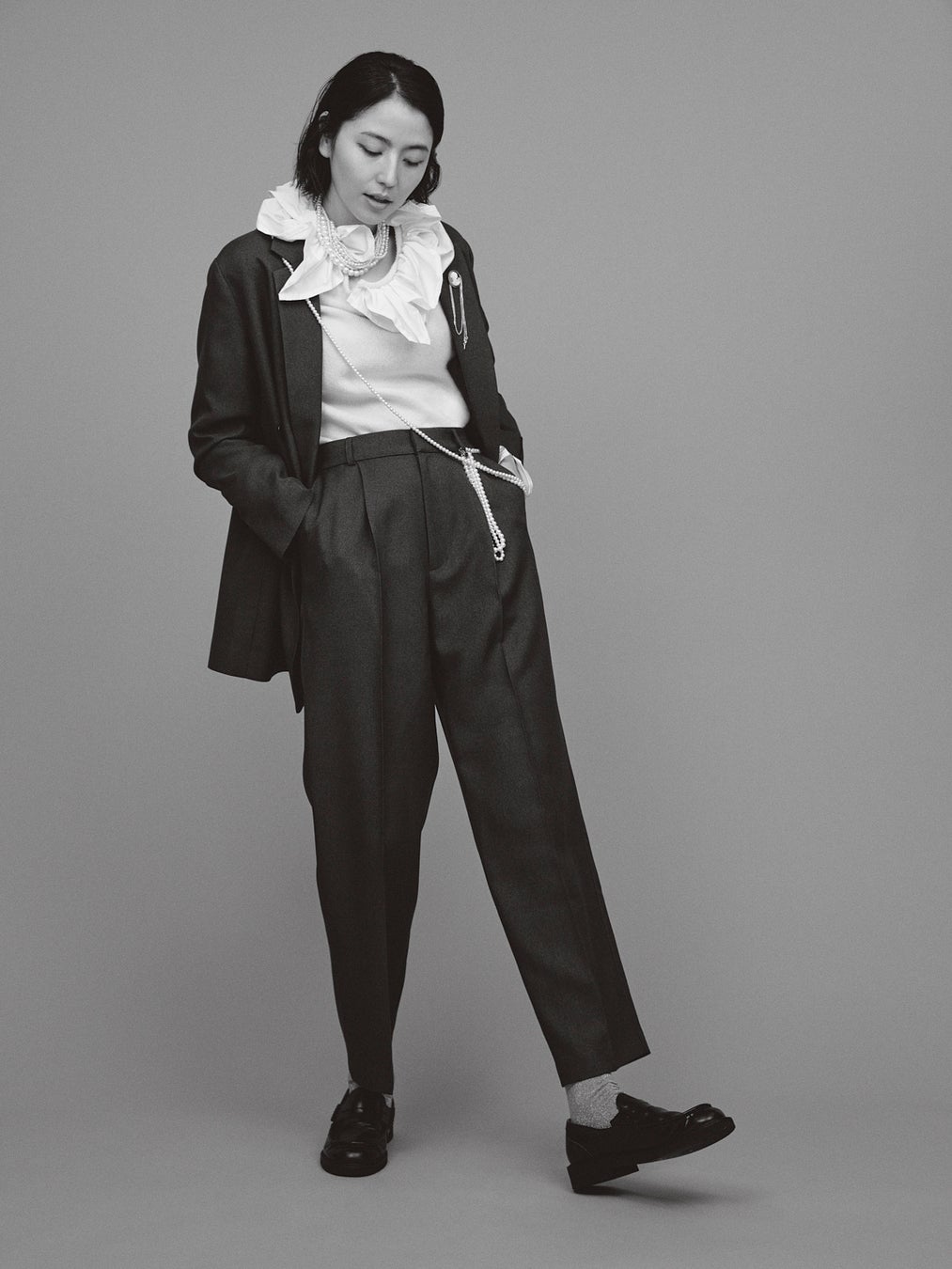 着用スタイルは、ジャケットのセットアップとニットを合わせ、ニットの象徴的な襟元や袖元のディテールを活かし、甘さと辛さのバランスを提案。アクセントに取り入れているパールのネックレスや、ブローチネックレスのあしらいにもご注目ください。