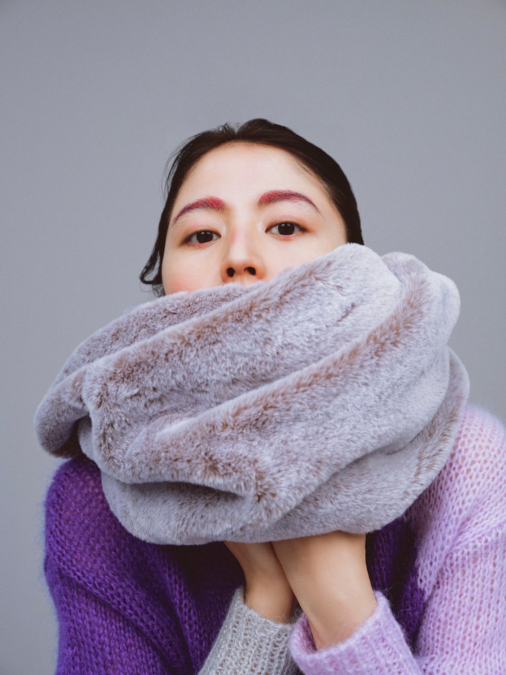 同ブランドで毎シーズン好評のモヘヤ素材のVネックカーディガンをベースに、〈Ray BEAMS〉ではクルーネックに仕様変更し、カラーリングにもこだわりました。2色のパープルと〈Ray BEAMS〉のシーズンテーマカラーの1つであるシルバーを袖にアクセントとして取り入れました。