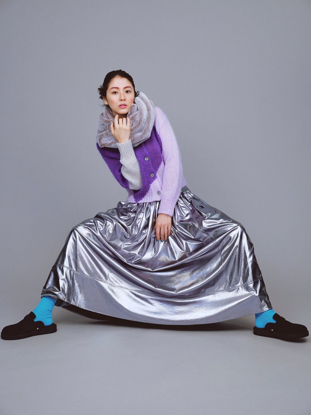 着用スタイルは、ニットカーディガンに〈Ray BEAMS〉のシルバーのスカートを合わせ、足元にはブルーのソックスがアクセント。カラーリングで魅せたルックをお楽しみください。