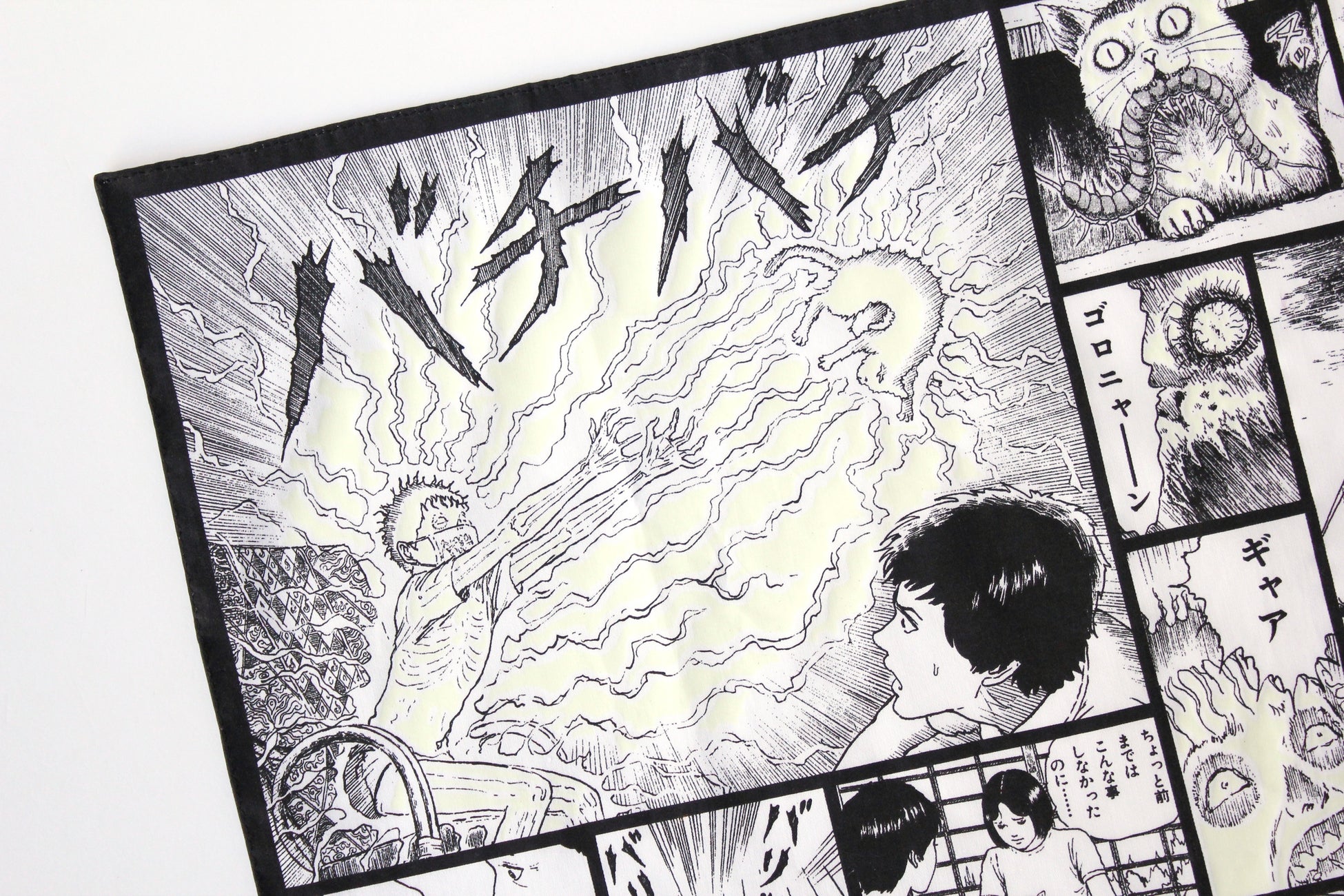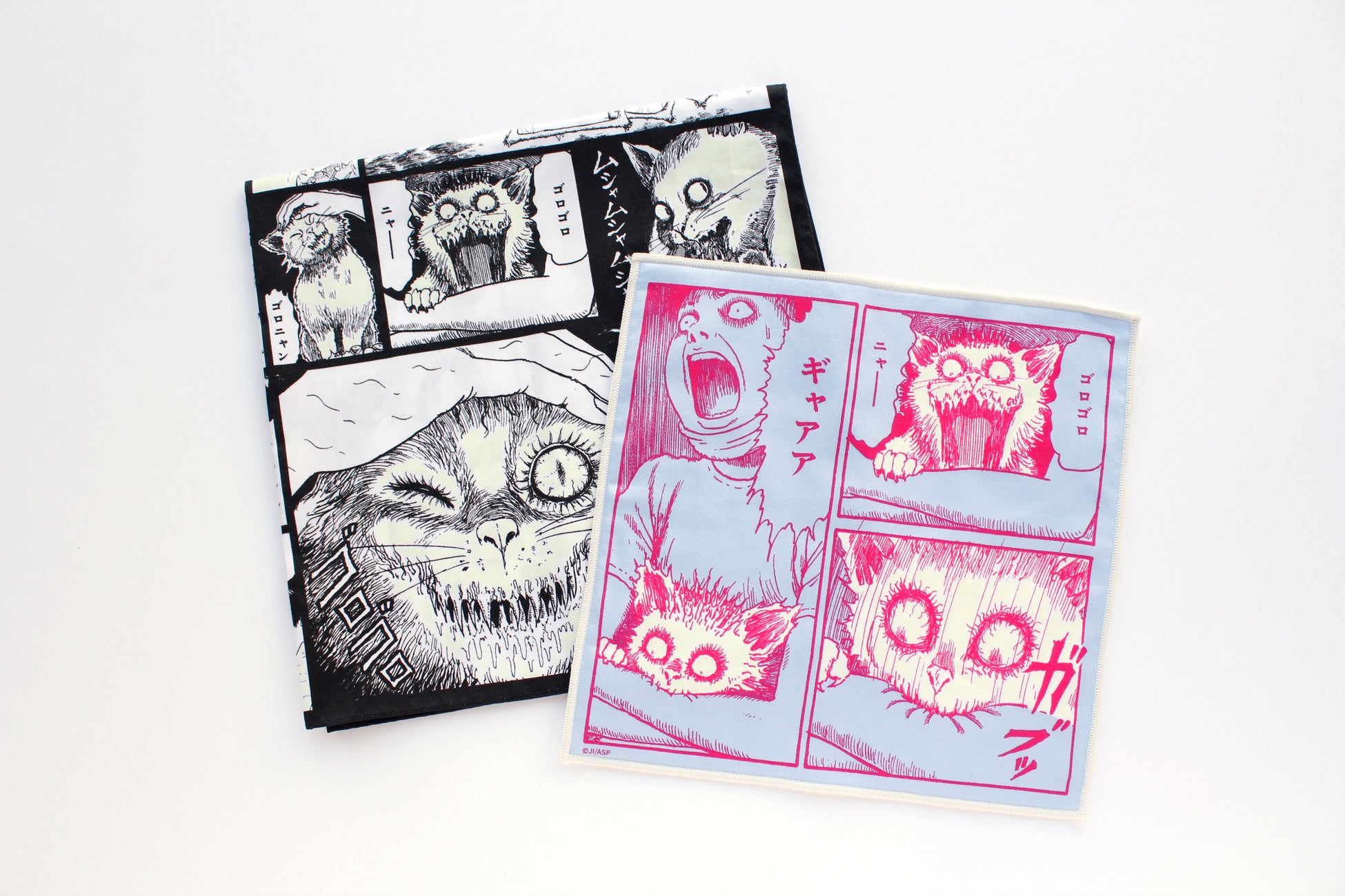 52㎝角の大判のハンカチは「呪い」をテーマにしており、双一が「呪いあれ〜」と言葉を放つコマを入れたのがポイント。色も呪いをイメージし、白黒の潔い配色だ。