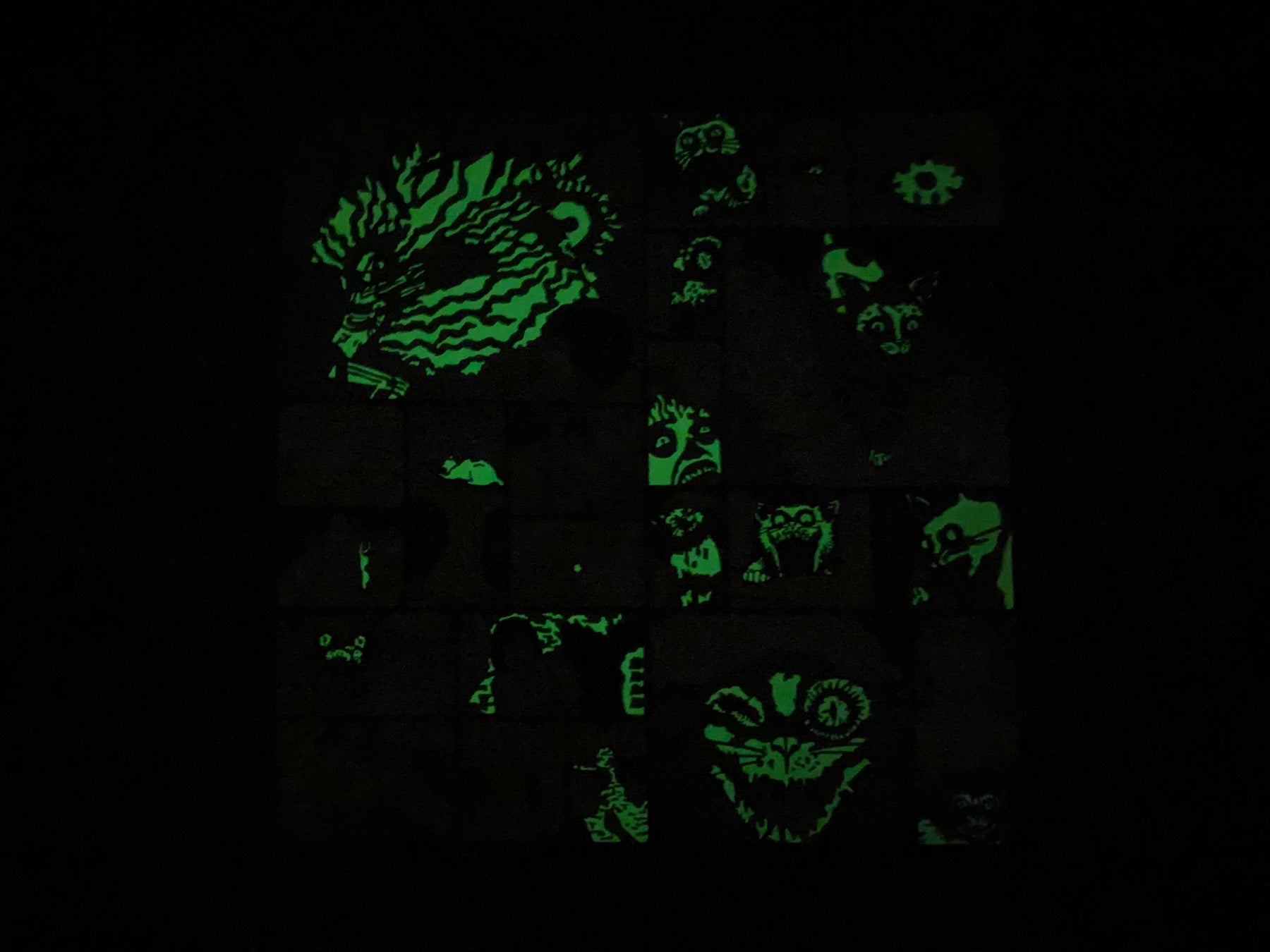 「Gallon」は、双一の呪いにより様子がおかしくなっていく猫のコロン。『双一の愛玩動物(2006)』より名場面を集め、蓄光プリントが暗闇で怪しく発光するハンカチ。