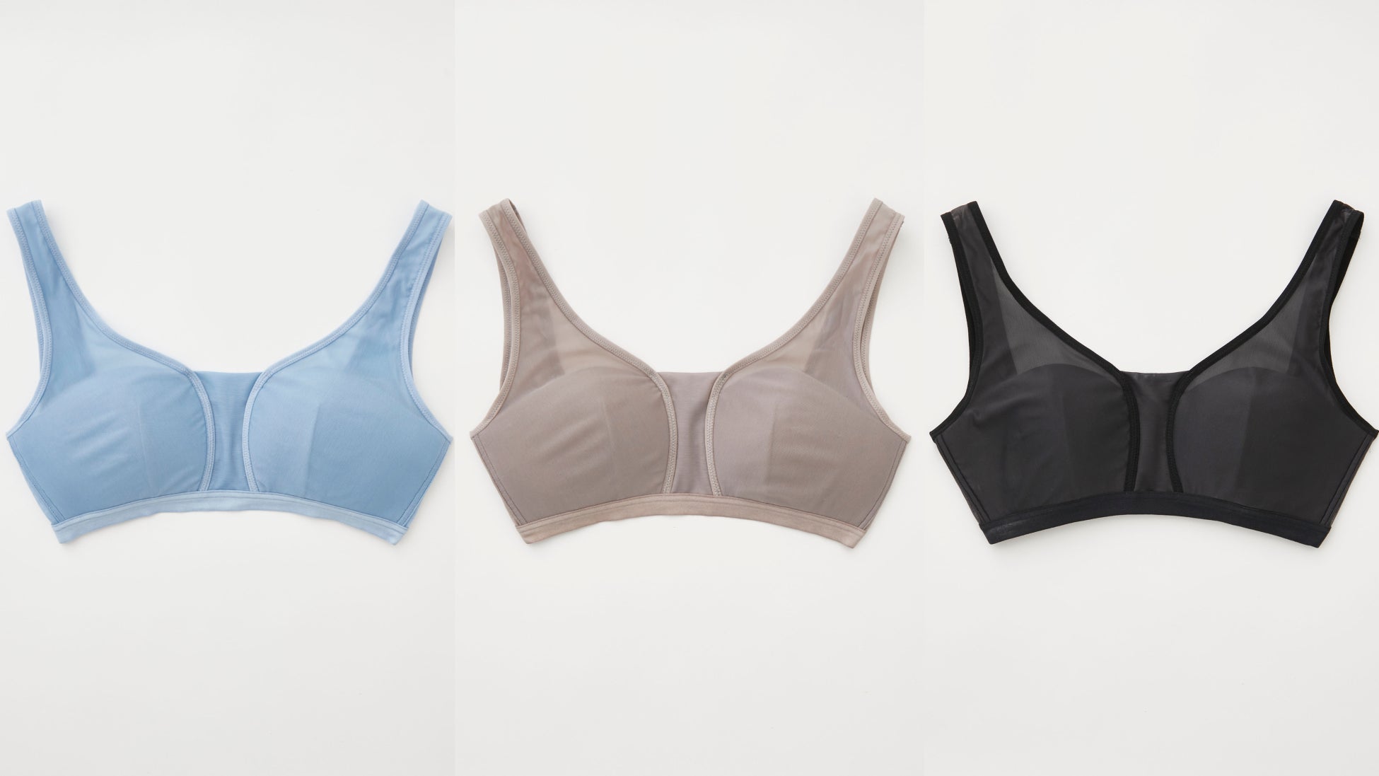 前中心(ブラジャーの中心部分)をメッシュ素材にすることで谷間のムレを軽減してくれます。内側の不織布は通常のものに比べ弾力性、通気性、耐久性があり製品自体の軽量化に貢献。また身体を締め付け過ぎないよう、背中が大きく開いたバックデザインを採用しています。さらにホック・タグを無くしているため肌当たりも少なくストレスフリーに。