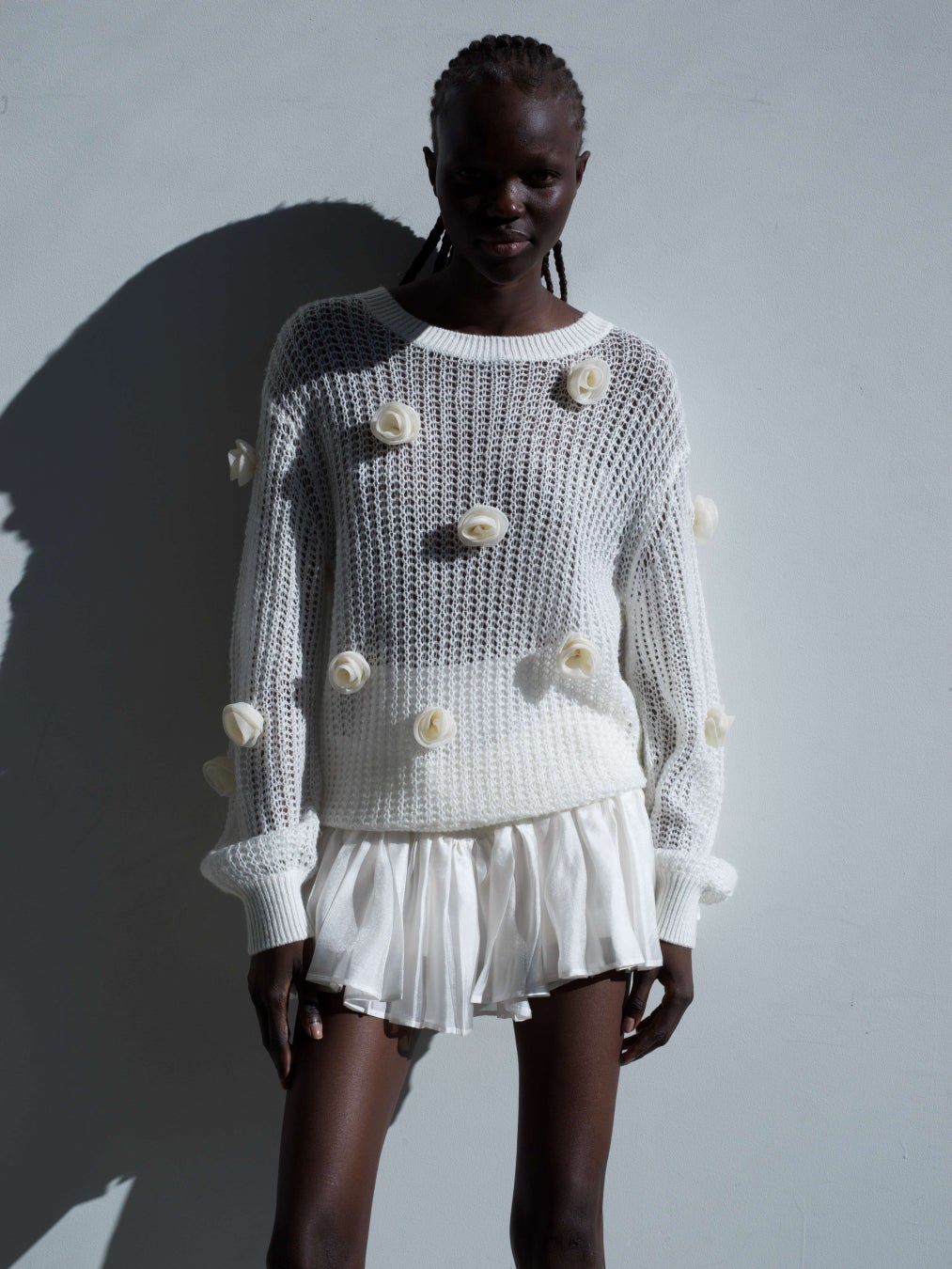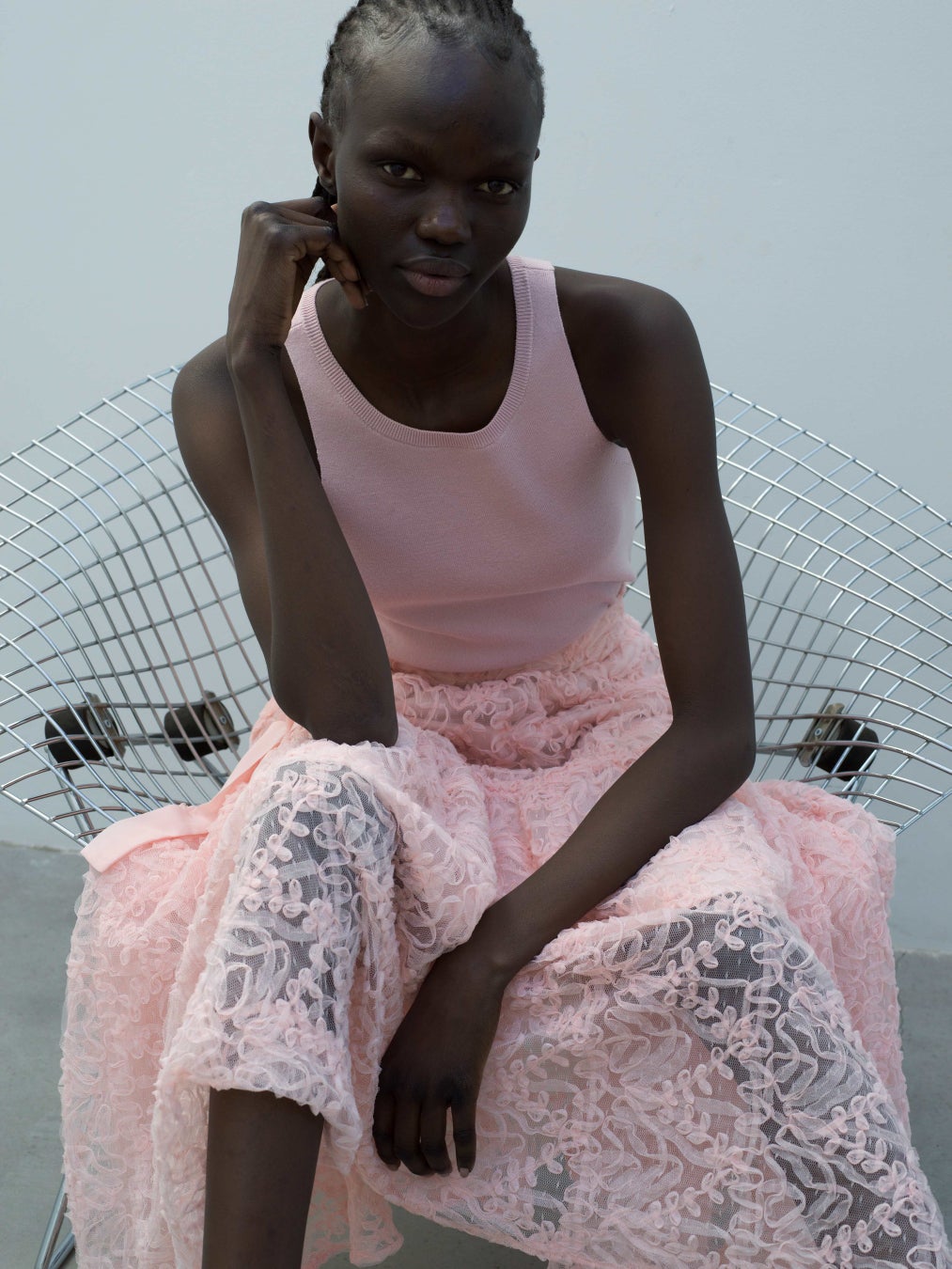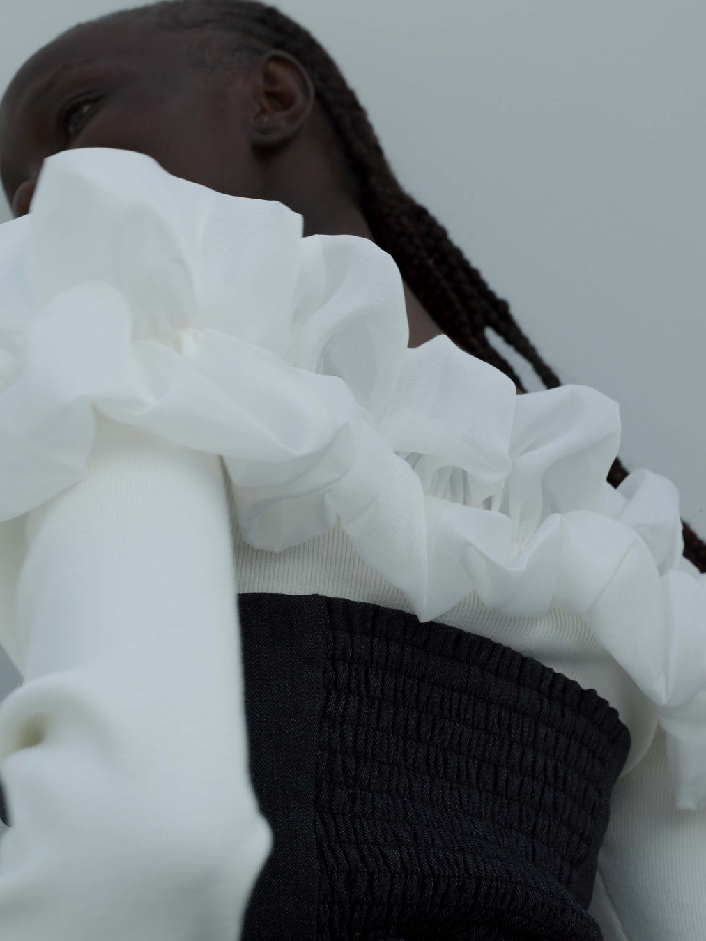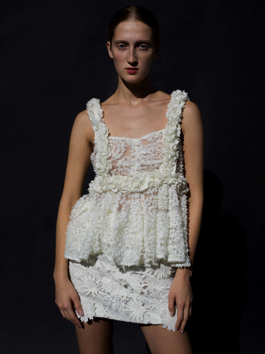 柔らかくガーリーなムードでありながらも大胆なシルエットによって力強さを表現。