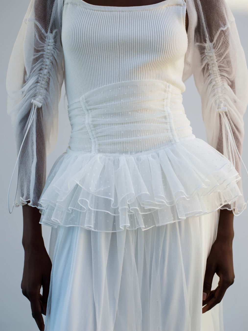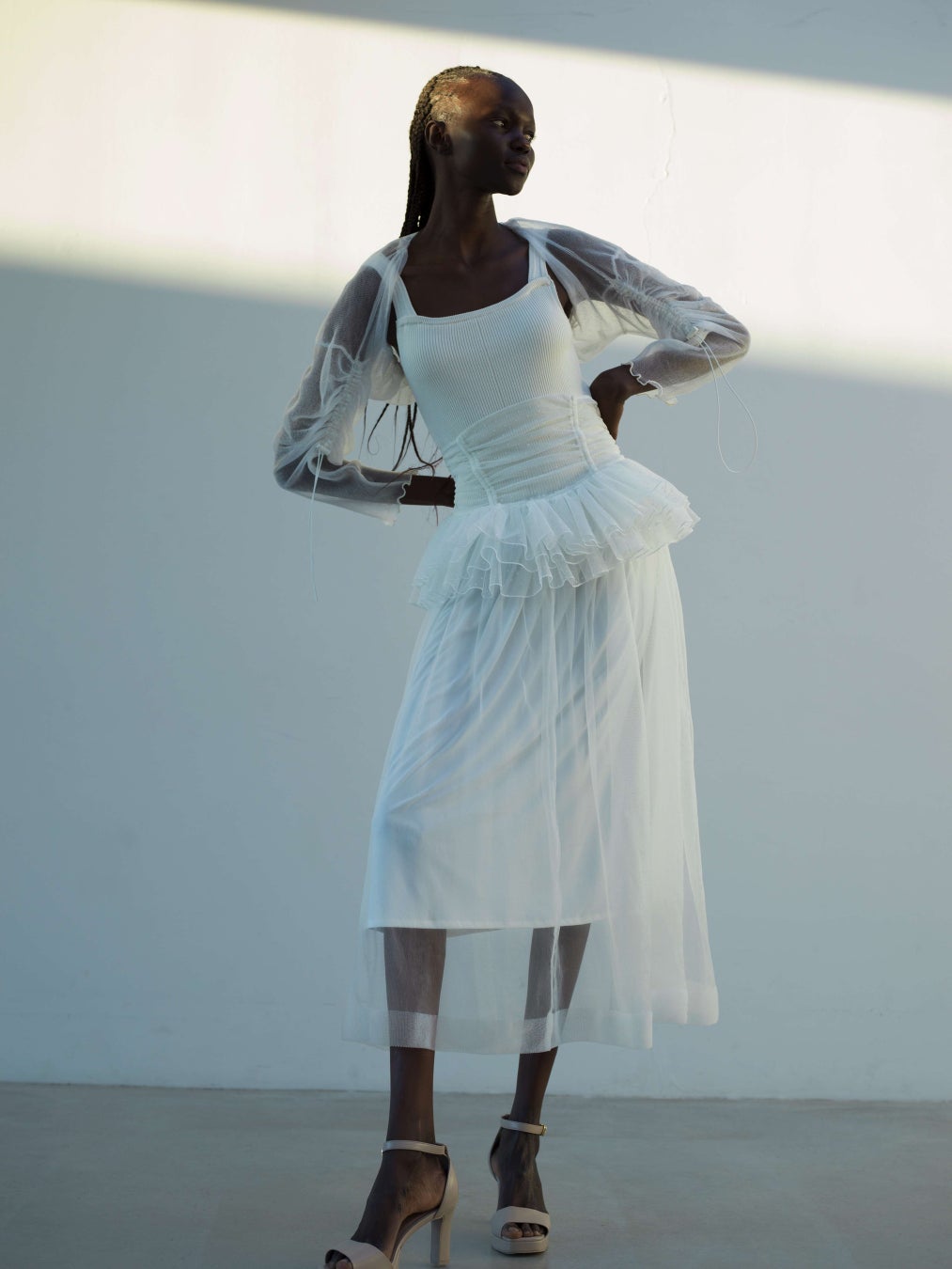 有機的なフォルムやチュールの大胆な素材使いで空気をはらみ、軽やかに飛動する。