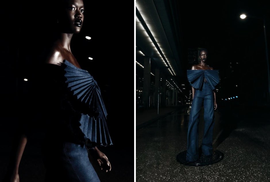 またプレタポルテとしてウェアラブルなボウ トップも制作しました。プリーツ・リボンのこのトップスは、力強くもフェミニンなスタイルで、大胆に個性を主張することができます。セルビッチデニムとチュールで作られたクラシックなリボンは、モダンなイブニングウェアの定番となることでしょう。