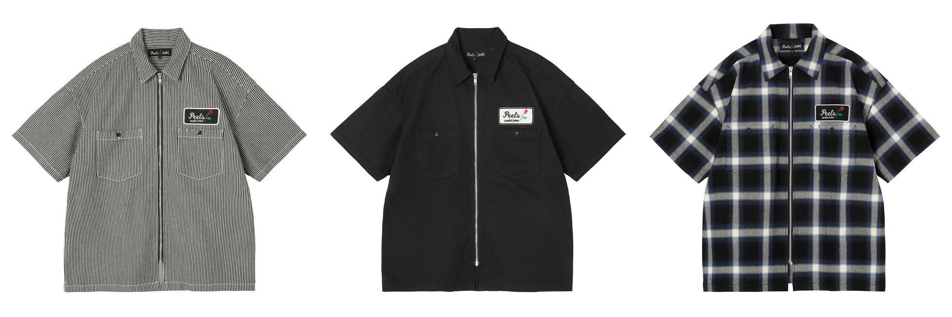 左、中央:X-girl × Peels ZIP UP SHIRT ¥14,300(税込)