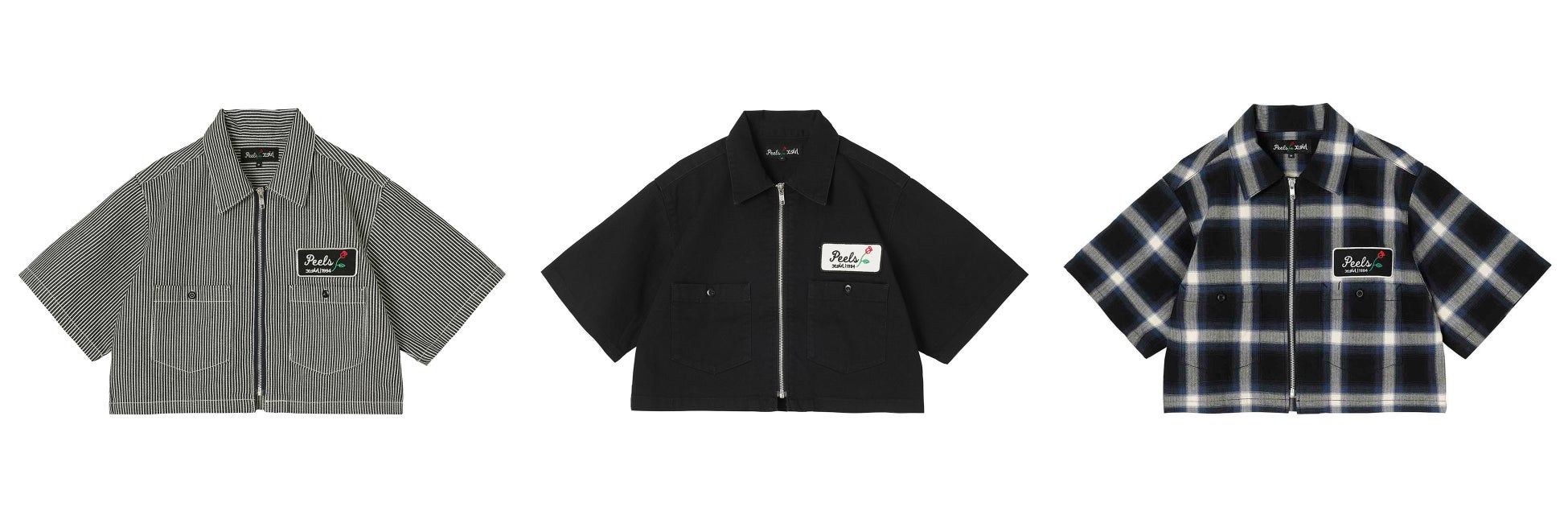 左、中央:X-girl × Peels ZIP UP CROPPED SHIRT ¥13,200(税込)
